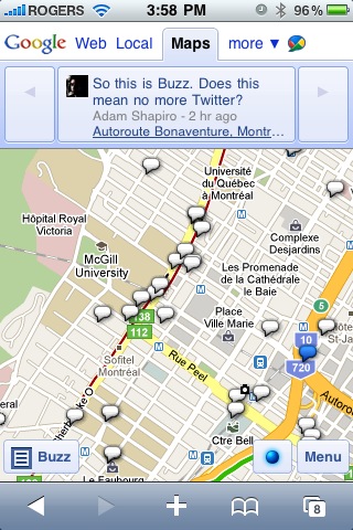 The Buzz Web App for iPhone and Android 2.0 phones is impressive, although I have seen some bugginess on Apple’s iconic device when trying to view maps. That aside, being able to localize Buzz is impressive since so many people are using the service already. Doing the same thing with Tweetie on the iPhone can be a big letdown when you see so few people around you tweeting.